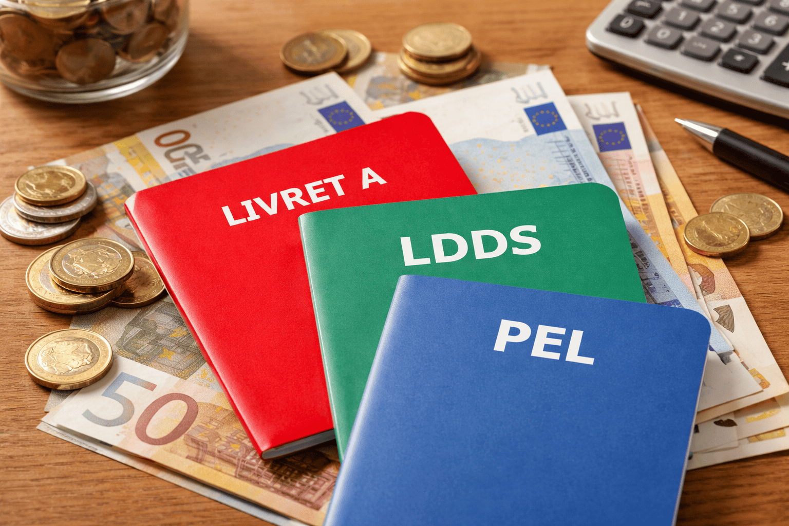 Livret A, LDDS et PEL posés sur une table en bois avec des billets et des pièces en euros